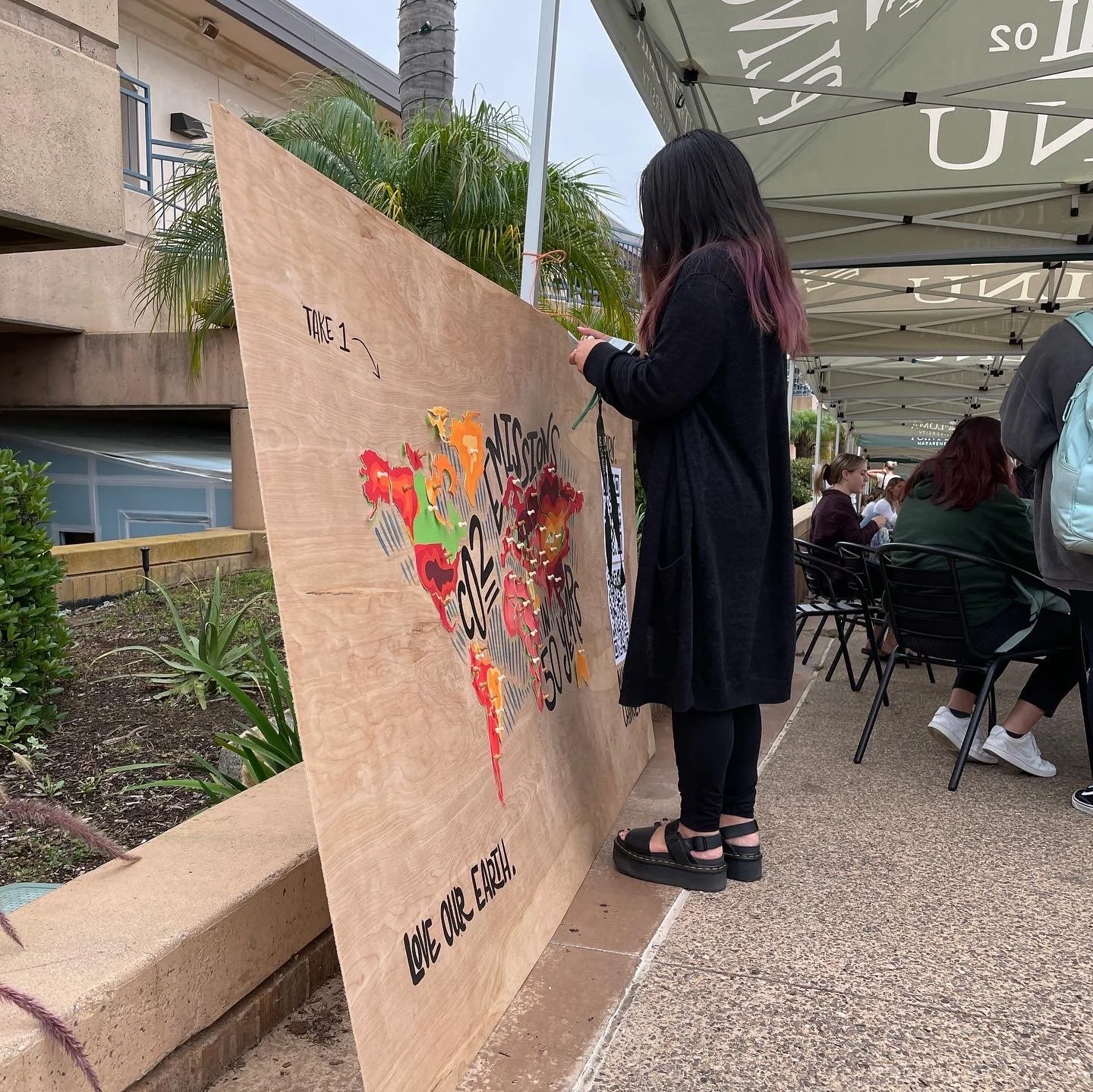 The piece is titled “Love our Earth.” It was created on a recycled piece of plywood and was 6ft wide and 3ft tall. I chose to create two layers to this project. The first was a painting of what the world should look like and the top layer was the temperature of the earth due to CO2 emissions. The second layer was cut into pieces that each had a QR code on the back that led users to plant a tree in the place they picked up or find more information about climate change.
